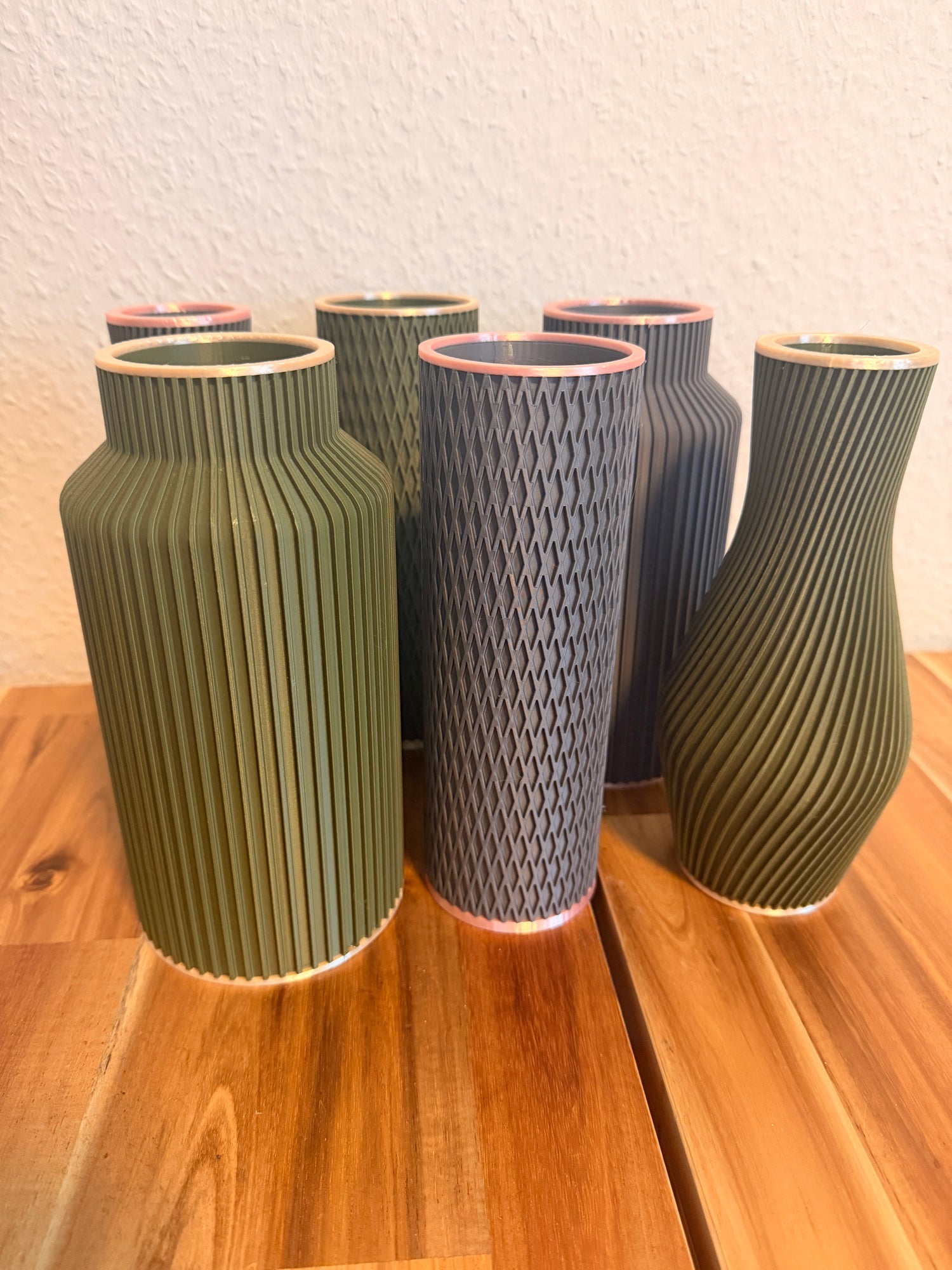 Unsere Vasen verbinden modernen 3D-Druck mit einer von Hand aufgetragenen Versiegelung, die sie zuverlässig wasserdicht macht. Jede Vase ist etwa 200 Millimeter hoch, wird umweltfreundlich aus PLA hergestellt und fügt sich mühelos in jedes Zuhause ein. Du bekommst sie in zwei Varianten: Grau mit pinkem Rand oder Dunkelgrün mit champagnerfarbenem Rand.